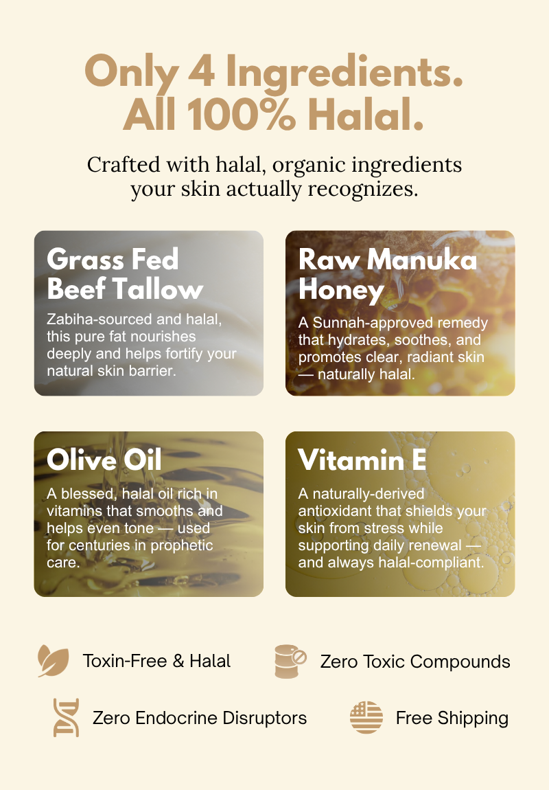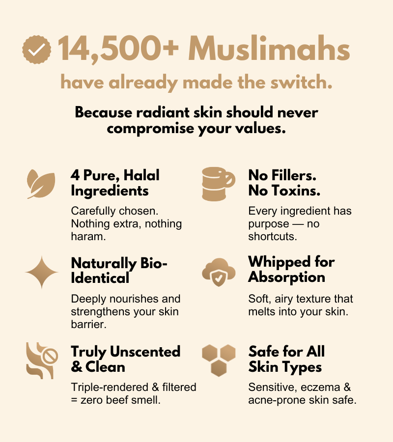 Yes. Tayyib Skincare only uses Tayyib Halal-certified beef tallow — meaning it’s both permissible and pure. No haram ingredients, no alcohol, and no animal by-products from non-halal sources. It’s skincare you can trust with your values.