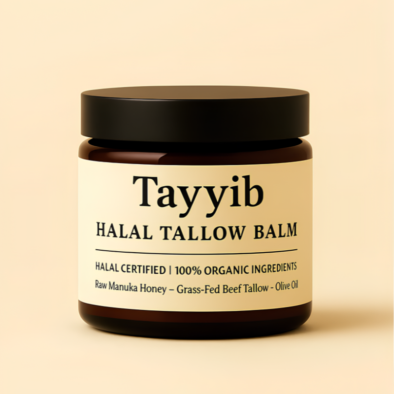 A halal-conscious moisturizer with only 4 ingredients — grass-fed tallow, Manuka honey, olive oil, and vitamin E. Whipped smooth, absorbs fast, no heaviness.